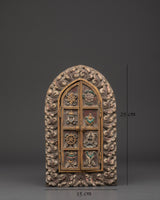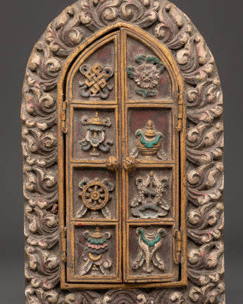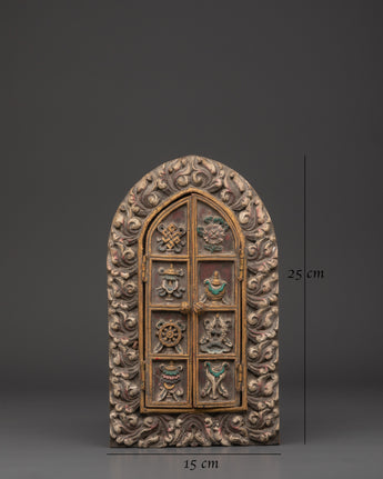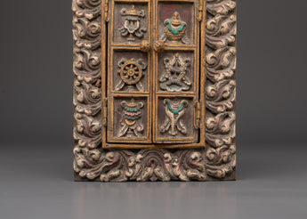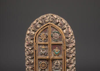 This portable shrine, crafted from wood and adorned with acrylic color highlights, showcases exquisite Himalayan craftsmanship and profound spiritual significance. The interior features a seated figure of Guru Rinpoche, holding a vajra and a skull cup, which radiates wisdom and compassionate power. Ideal for Tibetan Buddhist practitioners, sacred art collectors, or anybody looking to personalize their décoration room with authentic, meaningful décor.
