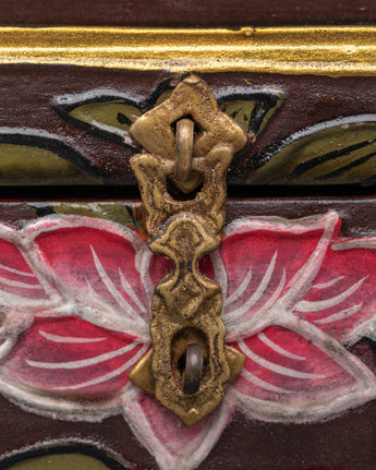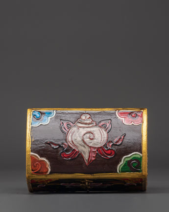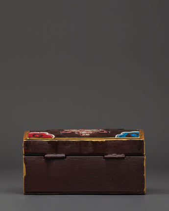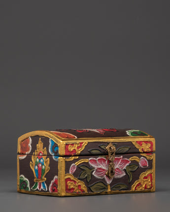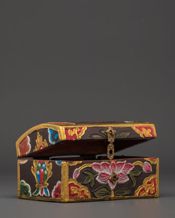 Enhance your spiritual environment with this beautifully hand-painted Tibetan wooden box, meticulously designed to store your most significant belongings. This box combines a traditional lotus motif and sacred Tibetan symbols, representing purity, enlightenment, and spiritual protection. Its vibrant colors and elaborate details render it both a practical storage solution and a piece of art.