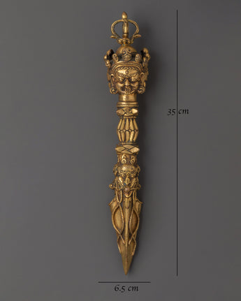 This Tibetan Handcrafted Phurba Dagger is a cherished Vajrakila ritual tool used in traditional Buddhist ceremonies. This sculpture, which is 35cm in length and is finely formed from copper with gold plating, represents deep spiritual symbolism. The Phurba, revered for its energy-cleansing abilities, symbolizes the annihilation of evil forces and the establishment of divine intention. Its striking appearance makes it an essential complement to any meditation practice or altar design.