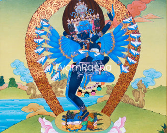 Admire the incomparable splendor of our Hevajra Thangka, a masterpiece of spirituality that perfectly captures the spirit of Tibetan Buddhism. This exquisitely painted thangka transports you to the heavenly world of Vajrayana Buddhism. It was made on strong cotton canvas using a vivid acrylic color palette and genuine 24K gold detailing. The angry god Hevajra is portrayed dynamically and aggressively, signifying the alchemical conversion of negativity into wisdom. This thangka is a meticulously made piece that adheres to old iconography and is in the revered Karma Gadri style, which is well-known for its fine craftsmanship. This spiritual masterpiece will last for a long time because of the strong foundation provided by the Cotton Canvas. Immersing yourself in the Hevajra Thangka's vibrant colors, complex patterns, and heavenly symbolism elevates it above mere artwork.