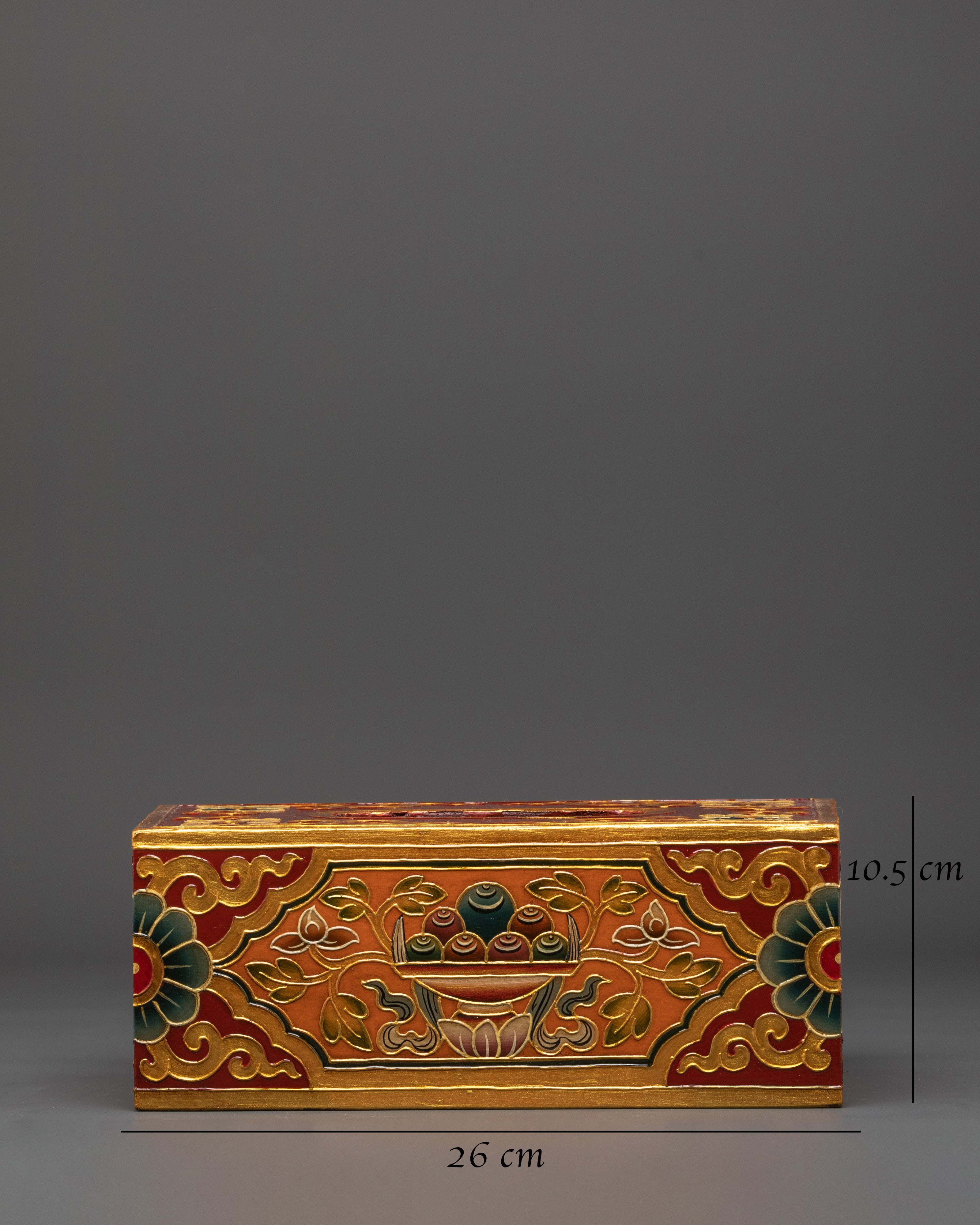 This Tibetan Home Decor Tissue Box will add the elegance of Himalayan workmanship to your home area. This rectangular tissue holder is handcrafted from high-quality wood and embellished with brilliant acrylic colors, reflecting traditional Tibetan design. It measures 10.5cm in height, 26cm in width, and 15.5cm in side width, making it both functional and visually beautiful. Its exquisite gold-lined design and symbolic floral motifs make it an ideal centerpiece for any living room, office, or meditation area.