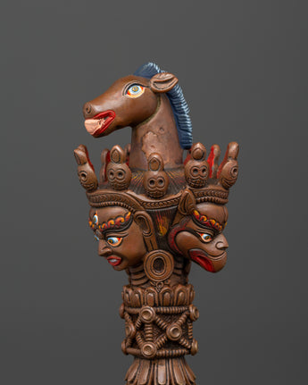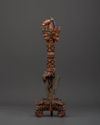 The Tibetan Iron Phurba is a handcrafted ritual dagger used for energy cleaning, spiritual protection, and meditation. Standing 37 cm tall and 11.5 cm wide, this unique and sacred weapon is adorned with detailed carvings, including the faces of three wrathful deities. The horse head at the top, the elephant head in the middle, and the snake head at the bottom of the dagger represent strength, wisdom, and transformation, respectively. The traditional Buddhist phurba, made of iron, is a vital ritual element believed to cut through negative energy and restore spiritual balance.