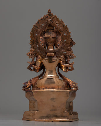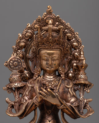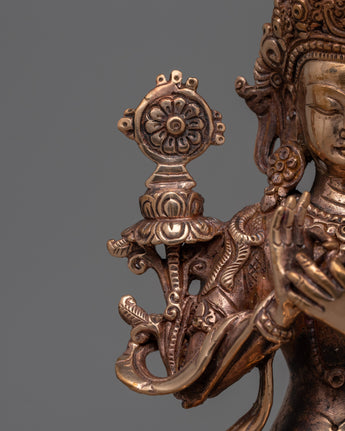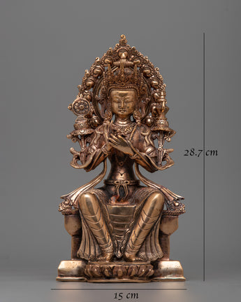 Our Tibetan Maitreya Buddha statue will add a calm presence to any spiritual area. Standing at 28.7 cm and carved on a copper body, this magnificent sculpture captures the spirit of Maitreya, the Buddha of the future. Every finely wrought detail is a stunning complement to any shrine or home décor, reflecting the expert workmanship and devotion of our craftsmen.