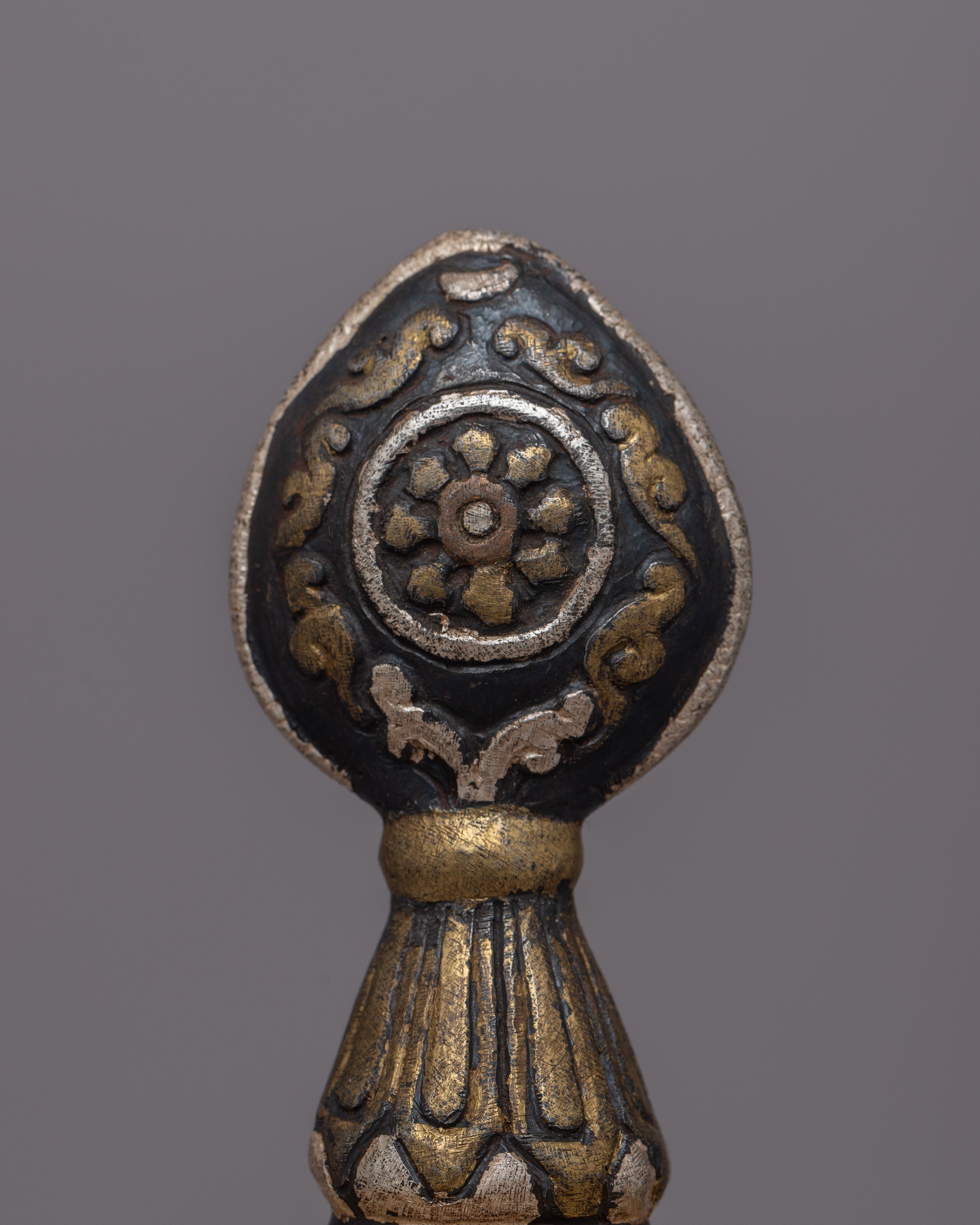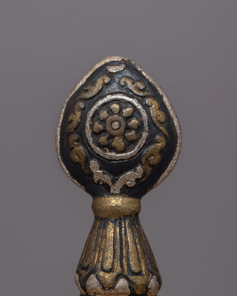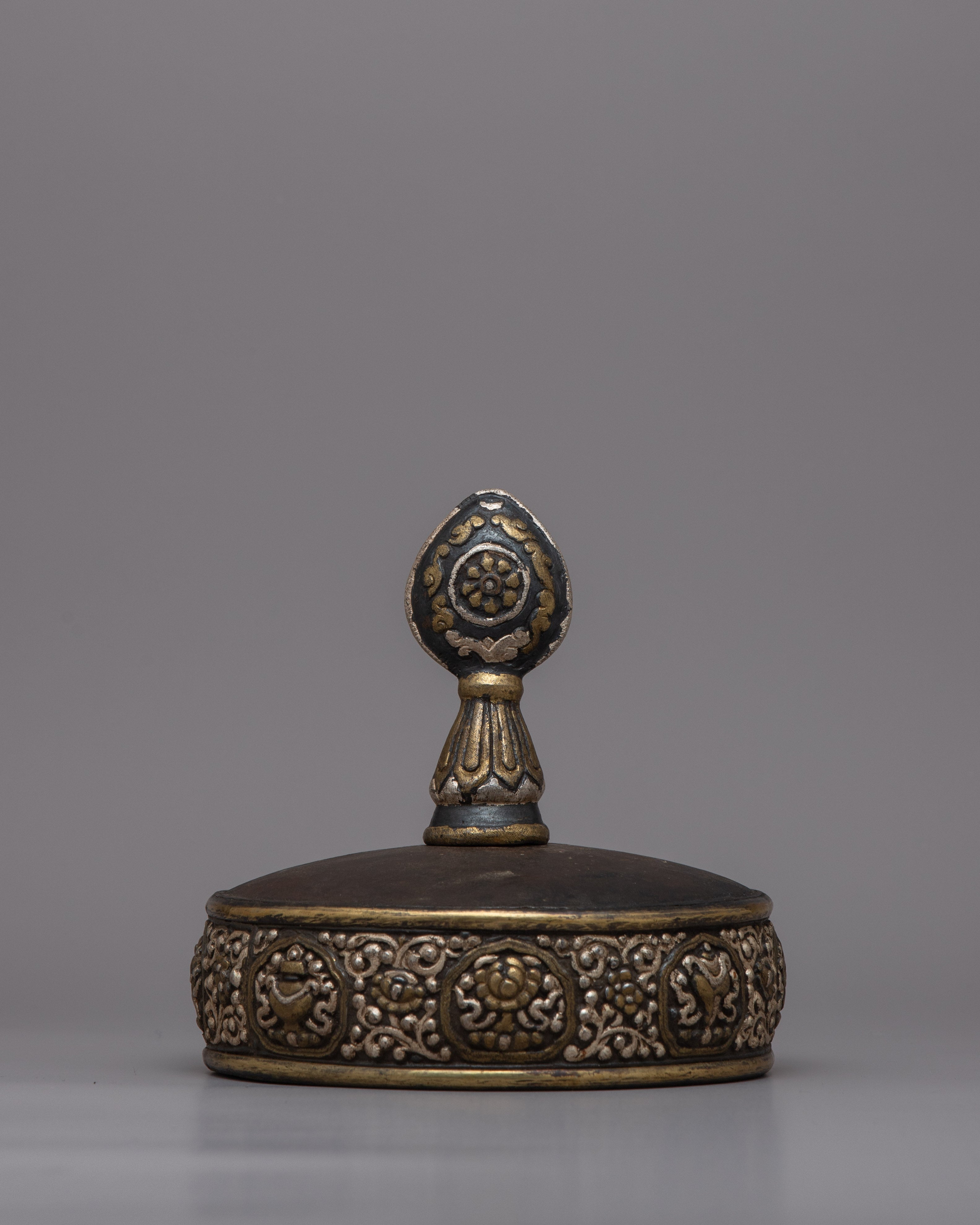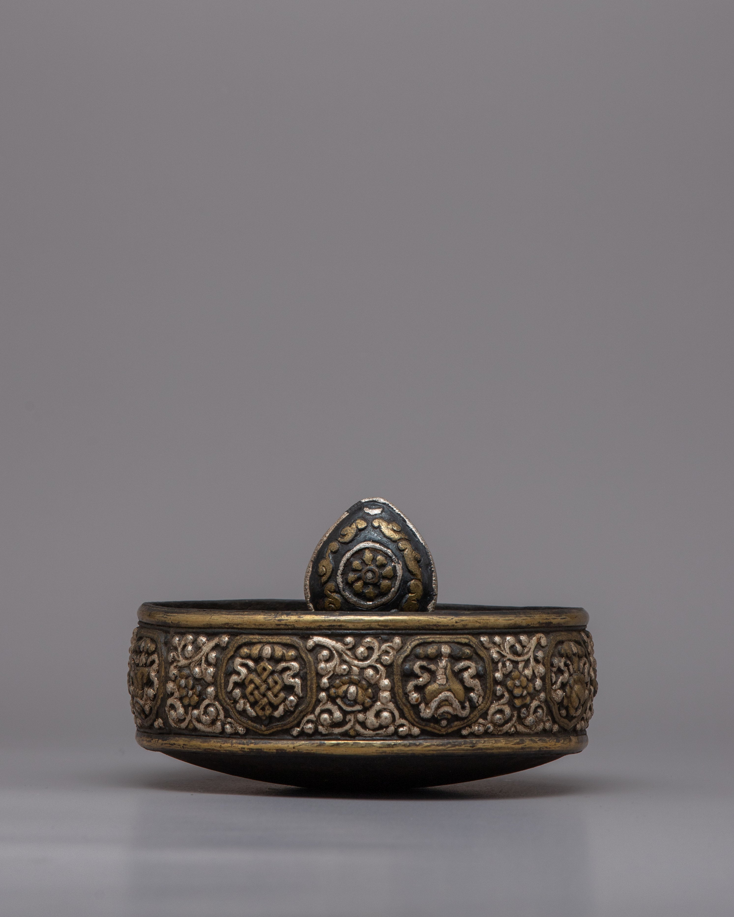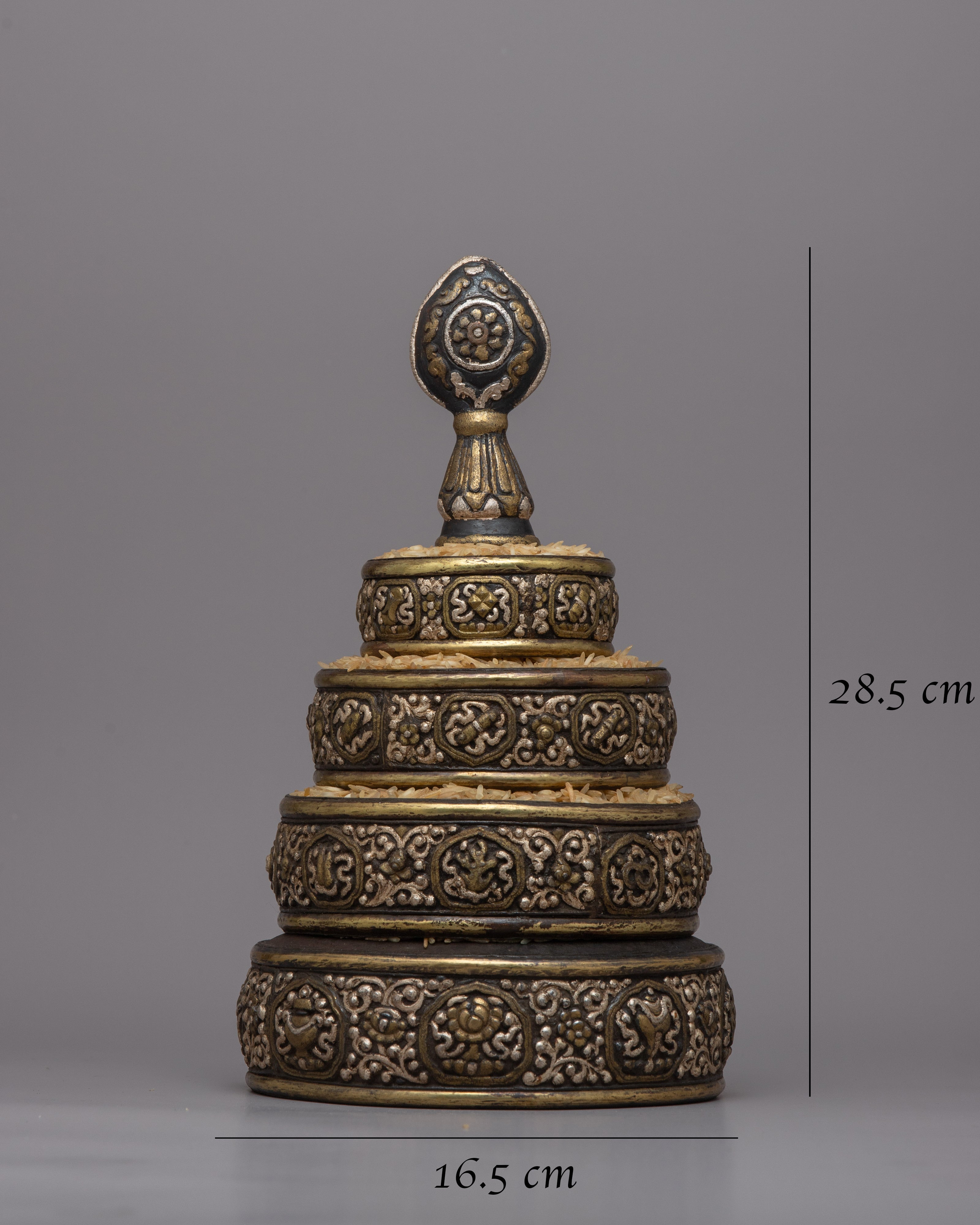 The Tibetan Mandala Offering Set is a stunning handcrafted ensemble that captures the rich spiritual legacy and delicate creativity of Tibetan culture. This magnificent set weighs 1.060 kg and is 28.5 cm in height and 16.5 cm in width. It is made of iron with intricate carvings and silver inlay. The exquisite workmanship and design reflect Tibetan Buddhism's profound meaning in mandala offerings, representing the cosmos and activities of devotion and charity.
