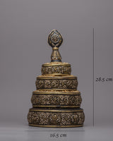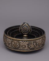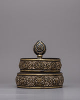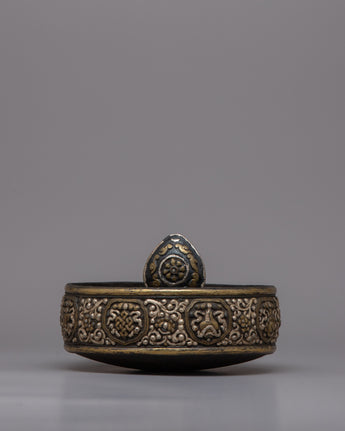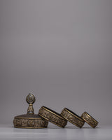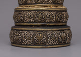 The Tibetan Mandala Offering Set is an excellent tool for ritual practice as well as a visually attractive decorative item, making it perfect for spiritual seekers, art collectors, and art enthusiasts. This set encourages deep thought and devotion whether it is utilized in meditation sessions, exhibited on a holy altar, or is part of a prestigious collection. Its deep spiritual symbolism and aesthetic beauty enhance any setting, making it a treasured addition to any collection or hallowed area. This offering set is more than just a pretty item; it's a significant relic representing fine craftsmanship and profound spiritual values.