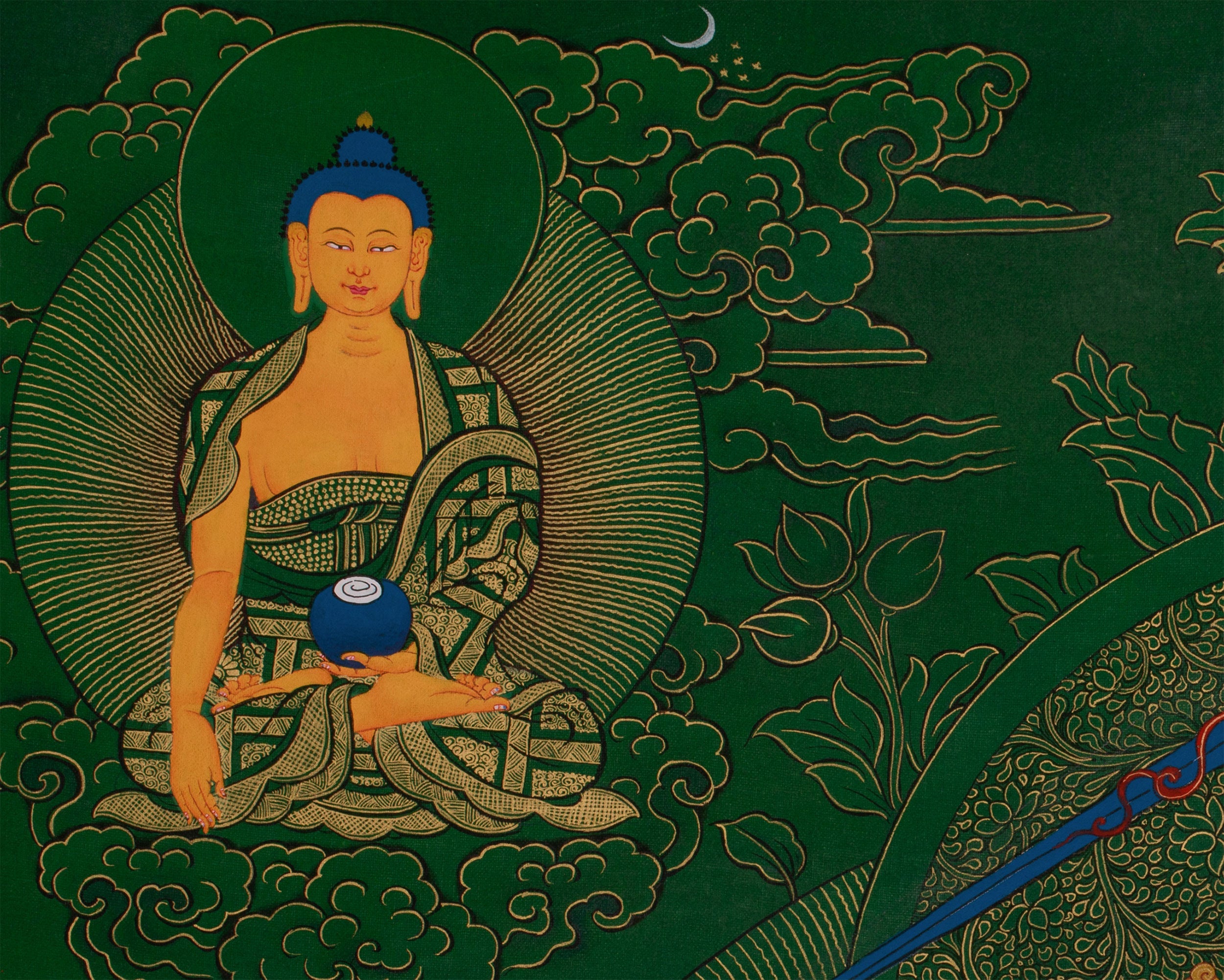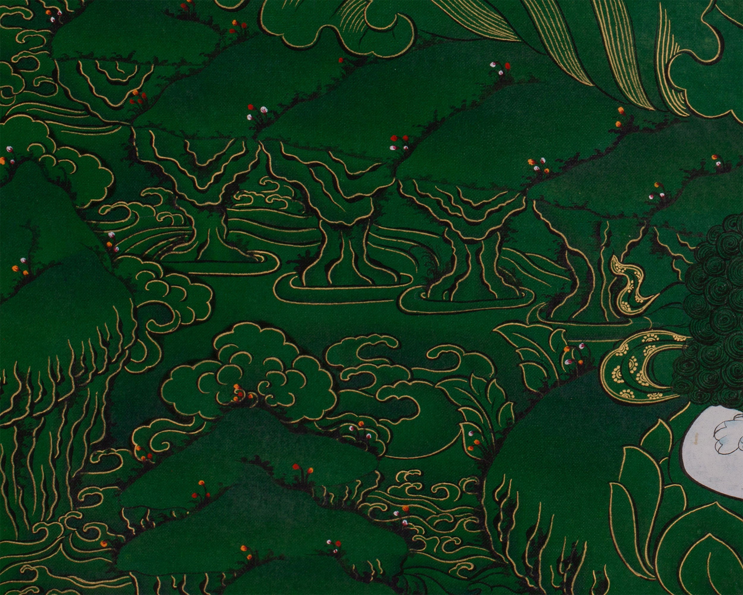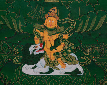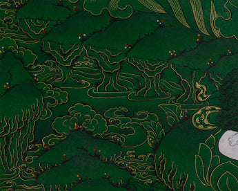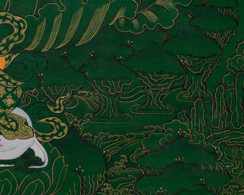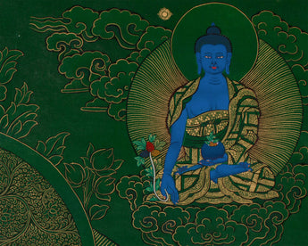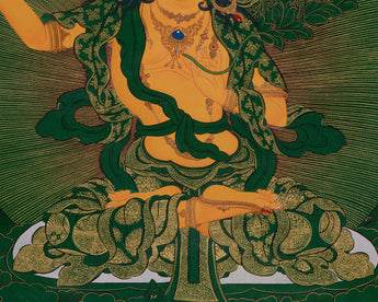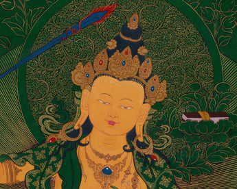This hand-painted thangka features the Tibetan Manjushri, the Bodhisattva of Wisdom, surrounded by revered deities Shakyamuni Buddha, Medicine Buddha, and Namtoshe. Each figure embodies spiritual qualities: wisdom, healing, and wealth protection. The artwork is on a lush green canvas, accentuated with genuine 24K gold. As the deities' bodies and key symbolic elements are rendered in vibrant acrylic colors, the rest of the composition gleams with golden intricacy. The painting exemplifies both artistic mastery and spiritual devotion. Skilled Nepali artisans render every detail using traditional techniques, Thangkaing a deep reverence for Tibetan iconography and artistic heritage.