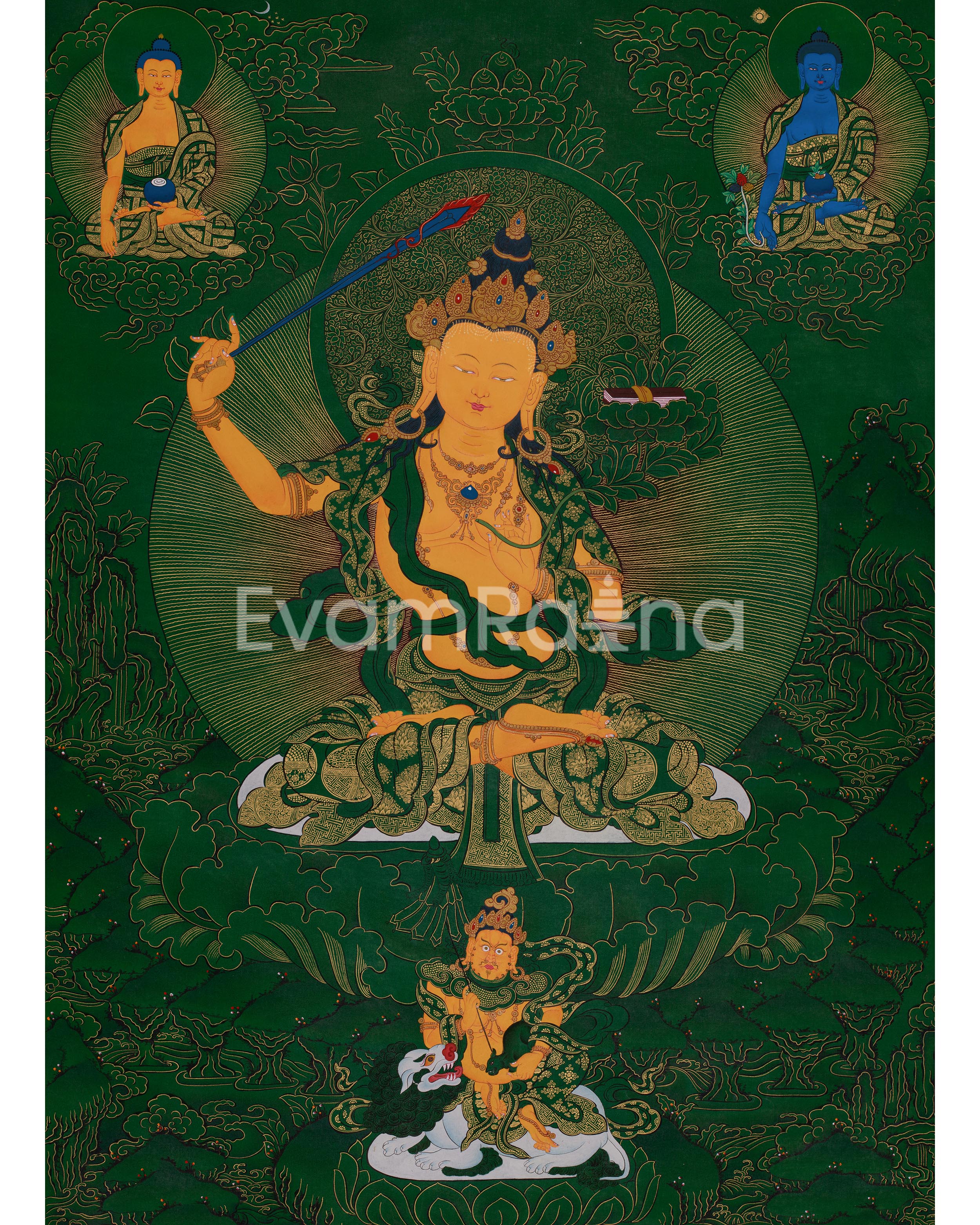 Manjushri, the Bodhisattva of Wisdom, is a central figure in Mahayana Buddhism, symbolizing enlightened wisdom, eloquence, and clarity of mind. He is holding a flaming sword in his right hand, representing the sharpness of wisdom that cuts through delusion, and a lotus flower in his left, supporting the Prajnaparamita Sutra. He is adorned with a five-jeweled crown, a flowing green scarf, and layered celestial garments embellished with intricate gold patterns. His calm and youthful appearance reflects the purity and clarity that wisdom brings to the practitioner's spiritual path. Surrounding Manjushri are three significant figures: Shakyamuni Buddha, the historical Buddha; the Medicine Buddha, the healing Buddha; and Namtoshe, the Guardian King of the North.