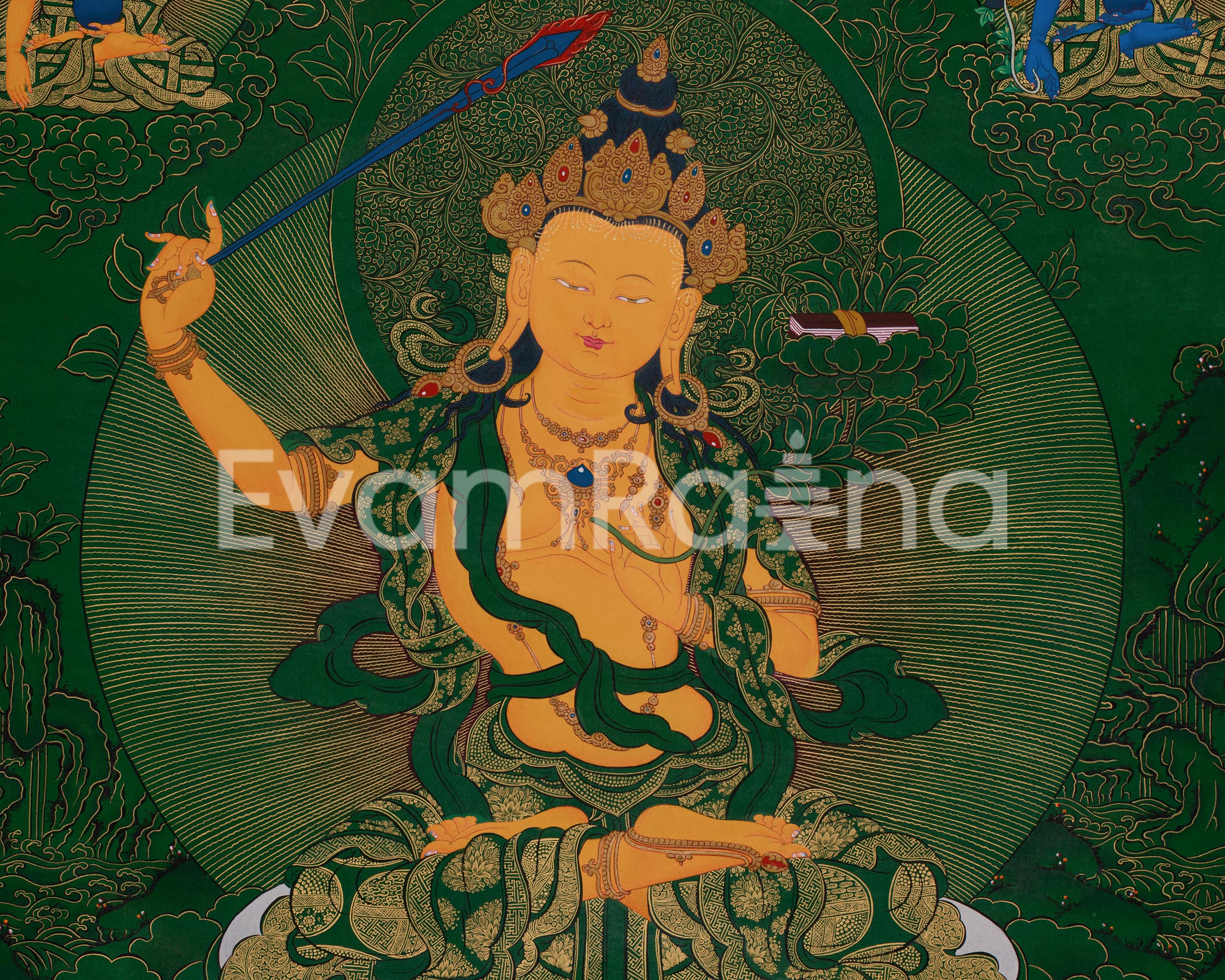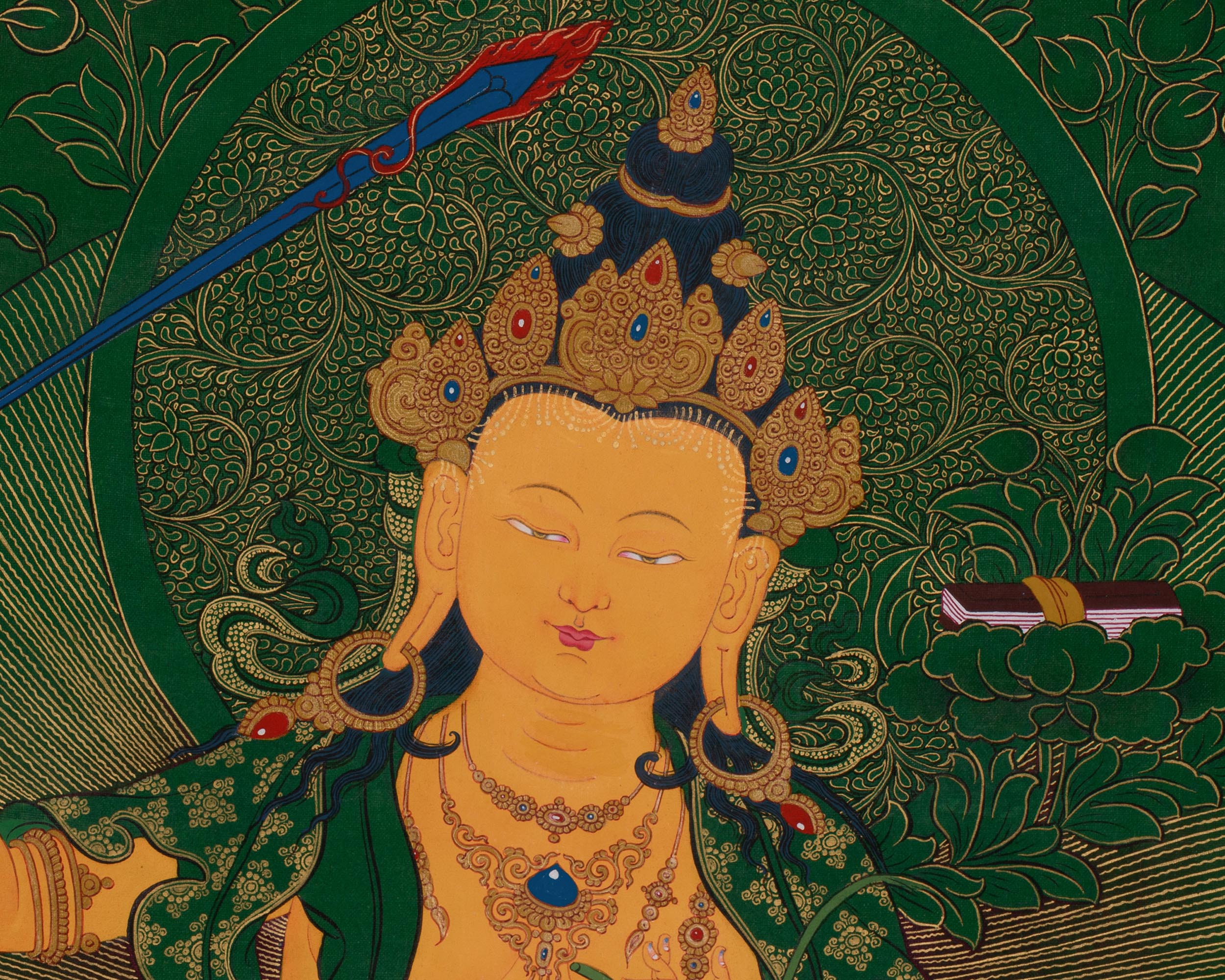 Hand-Painted Tibetan Manjushri | Sword-Wielding Bodhisattva | Thangka Featuring the Trinity of Enlightenment, Healing, and Prosperity