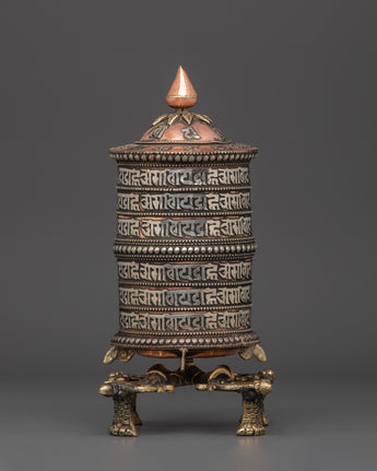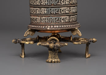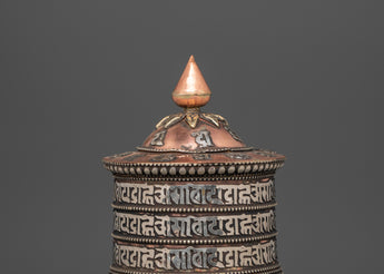 A Tibetan Mantra Spinner Wheel is used in Tibetan Buddhism to release blessings and spiritual merit when spun. It is frequently connected with the mantra "Om Mani Padme Hum," which is thought to unleash the power of compassion and protection. This piece's balanced base and smooth rotating mechanism make it an excellent addition to your meditation room or home altar, helping to deepen focus and improve your spiritual practice.