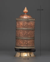 This Tibetan Mantra Wheel is a wonderfully created spiritual tool that will help you improve your meditation, mantra recitation, and energy healing practices. This prayer wheel, which stands 26.5cm tall and 11.5cm broad, is composed of copper and brass and has an attractive appearance. Weighing 0.55kg, it has a balanced feel when held, making it ideal for daily use or display on an altar. The mystical symbols and inscriptions on the wheel are intended to provide blessings and positive energy with each spin.