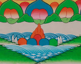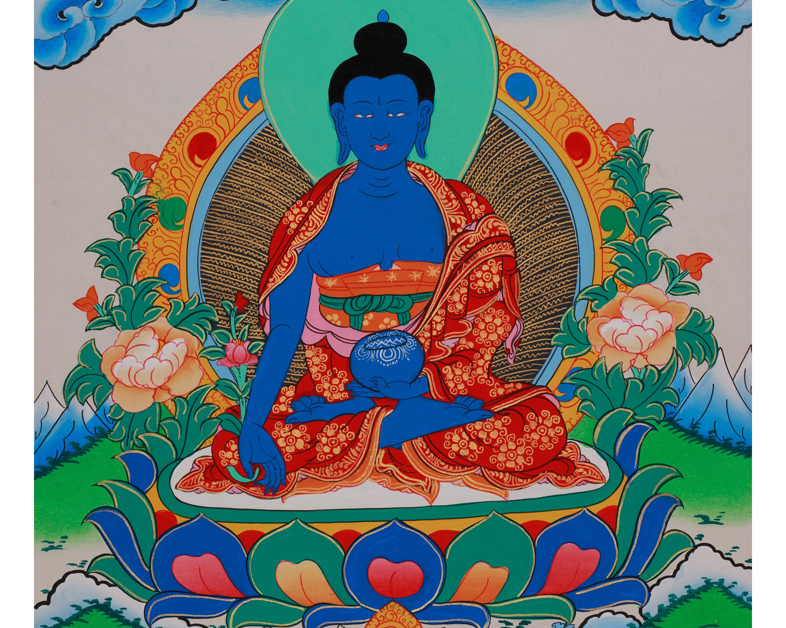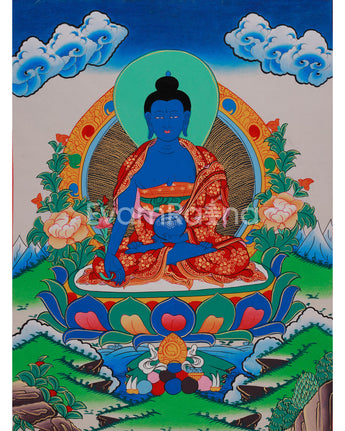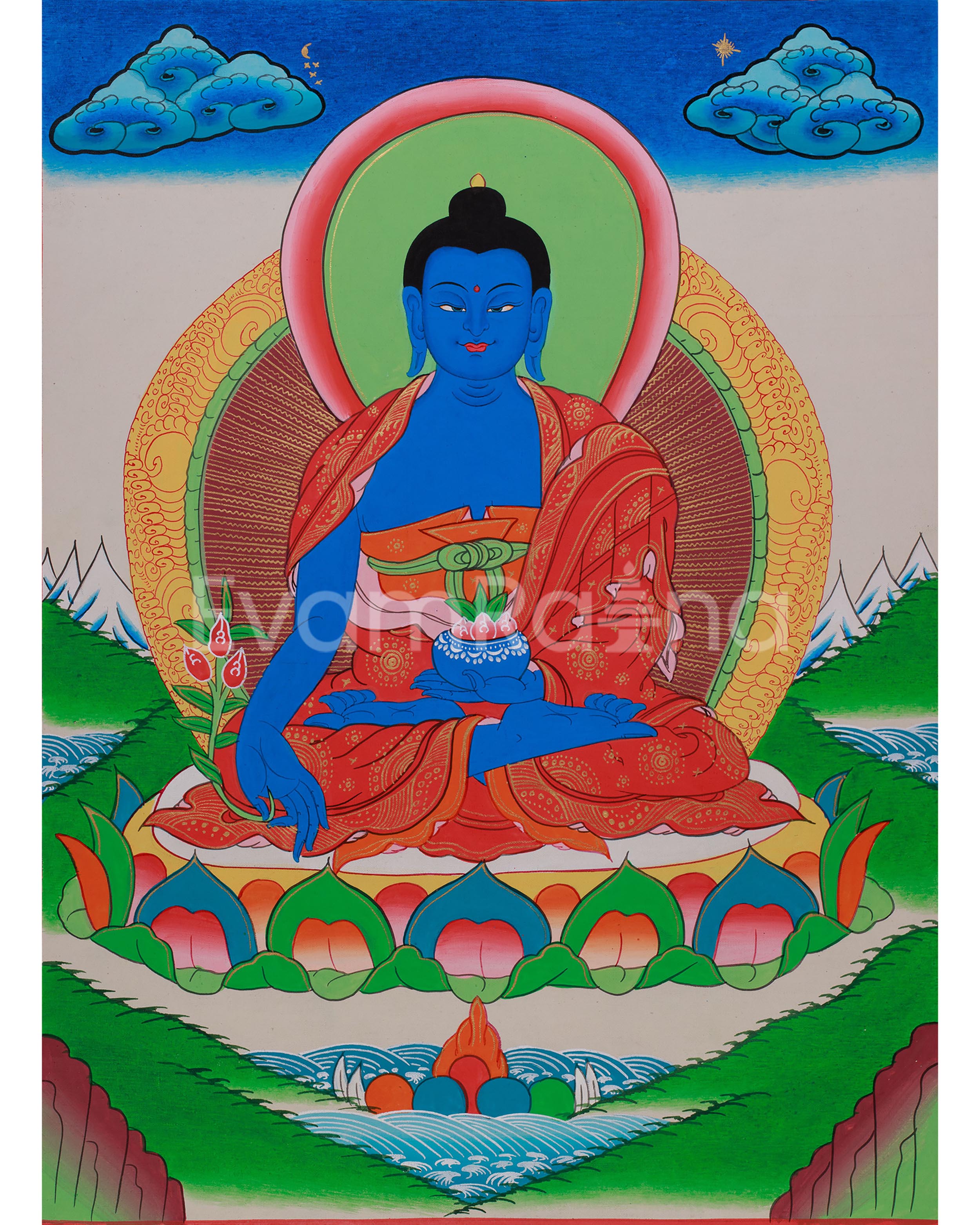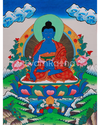 Medicine Buddha, also known as Bhaisajyaguru, represents the healing aspect of the Buddha, depicted with a deep blue body. He is shown in a serene meditation, holding a myrobalan plant in one hand and a medicine bowl in the other. This imagery symbolizes his vow to alleviate suffering and lead all beings toward ultimate health and enlightenment. The backdrop of vibrant mountains, flowing rivers, and blooming lotuses adds harmony and balance, symbolizing the restoration of the natural order through wisdom and compassion. This thangka is not just an art piece but a meditative focus and a source of blessing, ideal for healing spaces, home altars, or spiritual practice.