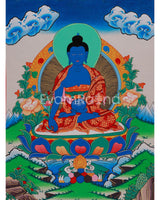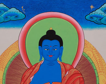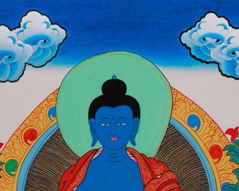 Calm, radiant, and deeply healing, this Tibetan Medicine Buddha Thangka embodies the timeless energy of compassion and restoration. Hand-painted in the traditional Himalayan style, it is a powerful symbol of spiritual and physical well-being. Created on durable cotton canvas, it features vivid acrylic colors and 24K gold coloring to enhance the image's spiritual presence. Each brushstroke follows centuries-old methods, applied with patience and precision by a skilled Nepali artist, ensuring high quality and spiritual authenticity.