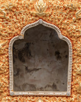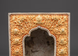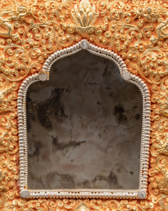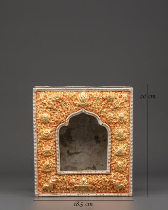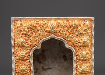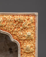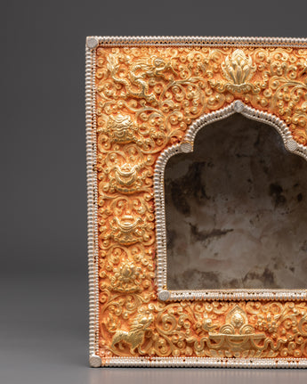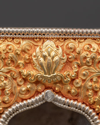 This Ghau box is expertly handcrafted from copper and plated with gold and silver. It features beautiful engraved designs of lotuses, dragons, and floral symbols, which represent purity, protection, and spiritual strength. The arched window opening at the front is intended to hold and display a deity or relic. The intricate detailing and dual-tone finish represent Himalayan devotional artistry.