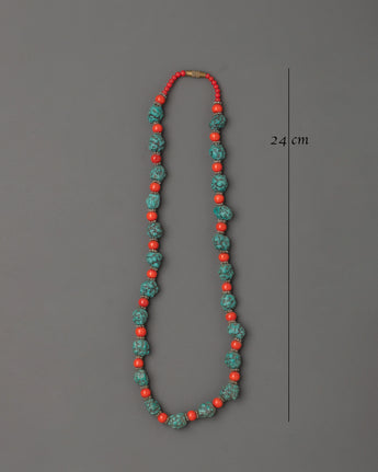 With a 24cm length and a lightweight design (0.042kg), this mala is ideal for travel, altar offerings, and personal use. The earthy green of turquoise blends with the warm coral tones, resulting in a striking yet sacred color combination commonly found in traditional Tibetan malas. This mala, whether used for spiritual connection or gifted with intention, will help you on your journey to inner calm and mindful awareness.