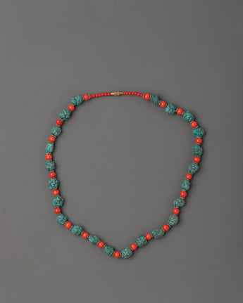 These Tibetan Meditation Mala Beads, made of artificial turquoise and coral stones, promote clarity and spiritual focus. This sacred mala is perfect for mantra chanting, daily meditation, and as a meaningful ritual companion. Each bead, rooted in Himalayan tradition, represents balance and spiritual intention, helping you focus your energy during prayer or meditation.