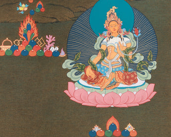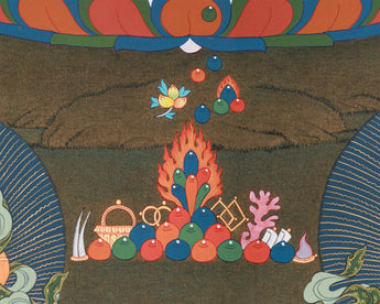 Together, these three deities symbolize the comprehensive protection and accumulation of wealth, from material to spiritual prosperity. Namtoshe guards against loss and harm, Dzambhala actively attracts wealth, and Vasundhara nurtures growth and sustenance. Owning this Thangka signifies welcoming prosperity, protection, and spiritual development into one's life. It serves as a powerful talisman for personal devotion or an inspiring addition to a collection, symbolizing abundance and resilience.