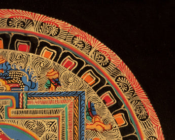At the center of the mandala, "Om" is surrounded by a protective triangle, radiating powerful spiritual energy. It is surrounded by intricate rings of flames, lotus petals, and vajra gates, each symbolizing distinct stages of purification, initiation, and spiritual revelation. The perfect symmetry and sacred proportions reflect the harmony of the universe, drawing the mind inward to its source. Unlike deity-focused thangkas, this composition centers on the audible and symbolic significance of creation, making it suitable for those seeking inner stillness, clarity, and a connection to the universal vibration of Om.