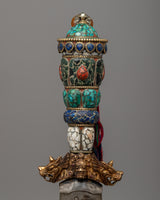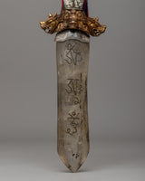 This stunning 43cm Tibetan Phurba Dagger with Crystal Blader is a potent emblem of spiritual strength and transformation. This artifact, which has a crystal blade and a copper body plated with gold and 92.5% pure silver, is a masterpiece of craftsmanship and sacred energy. The elaborate handle is adorned with Original stones, including coral, turquoise, and lapis lazuli, representing protection, healing, and spiritual insight. The brilliant conch shell accents and vibrant tassels add to its beauty and cultural significance.
