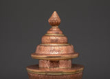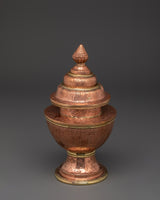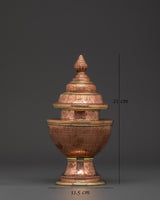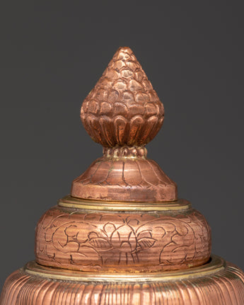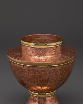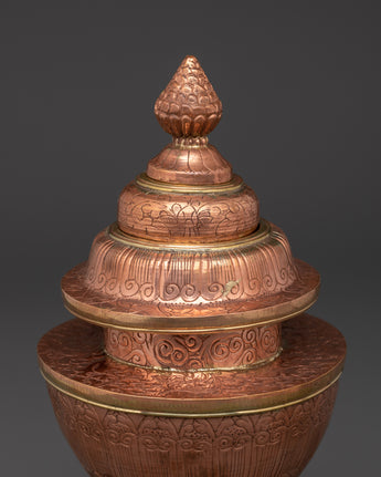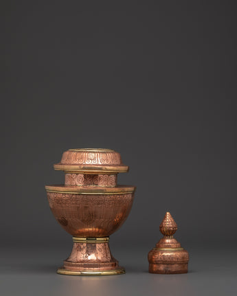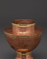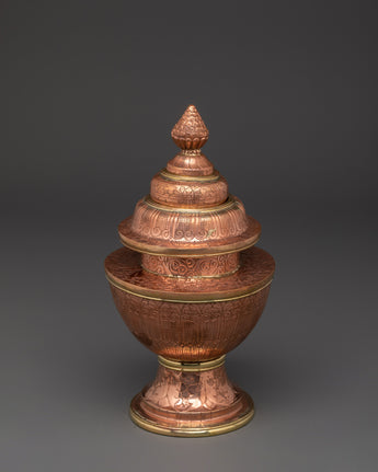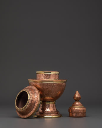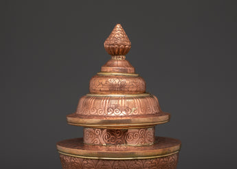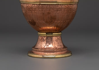 This offering pot, meticulously handcrafted by Himalayan artisans, includes intricate engravings and tiered layers, finishing in a flame-shaped finial cover. The use of copper and brass not only enhances the pot's visual appeal but also underscores its dual spiritual and practical significance. Copper is admired for its dynamic conductivity, while brass offers a gleaming glow that enhances its ceremonial presence. Whether used for daily altar activities, formal rituals, or as a sacred decorative element, this cup brings blessings, reverence, and spiritual attention to any space.