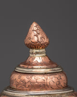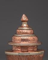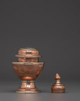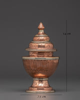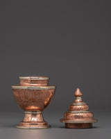 This vessel, handcrafted by skilled artisans, is constructed of polished copper and features delicate white metal accents that add visual harmony and cultural richness. Its carefully engraved decorations and tiered lid reflect the sacred iconography of Tibetan ritual art. Whether used in daily puja, displayed on a shrine, or given to a spiritual practitioner, this rice cup adds reverence, beauty, and intention to any ceremonial environment.