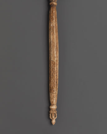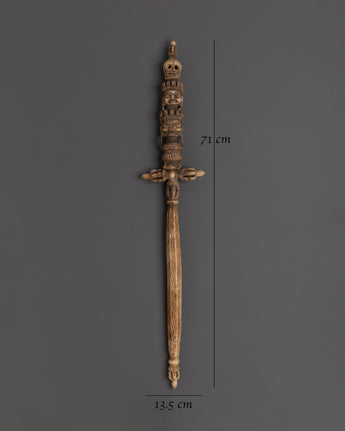The Tibetan Ritual Phurba Dagger is a sacred spiritual tool, precisely designed to assist in meditation, spiritual rites, and defense. This beautiful dagger, which measures 71cm in height and 13.5cm in width, features an ethically sourced buffalo bone inlay. The Phurba is revered for its cultural and ritual significance, symbolizing spiritual transformation, protection, and energy grounding during meditation. Its sharp, three-pronged blade symbolizes the removal of negative forces and is used in sacred rituals to seal and protect areas.