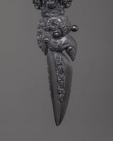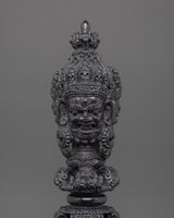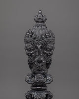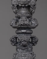 The craftsmanship of this saligram phurba reveals intricate detail and symbolic artistry. The triple-sided blade represents the cutting away of ignorance, attachment, and aversion. At the same time, the wrathful deity at the hilt embodies Vajrakilaya — the enlightened protector who transforms negativity with fierce compassion. From the finely carved faces to the ornamental knots and flame-inspired patterns, each element speaks to the depth of Tibetan symbolism and devotion.