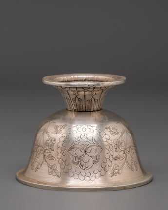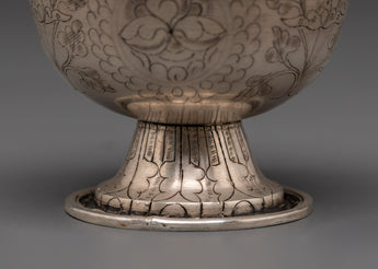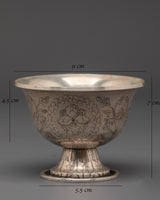 These bowls, which are hand-engraved with intricate Tibetan designs, are both beautiful and hold spiritual significance. Their durability and religious appeal are enhanced by the silver plating, making them ideal for use in temple rituals or on altars. Each bowl weighs about 0.086 kg, and the entire set weighs 0.64 kg. It is lightweight but dependable. This collection represents purity, devotion, and tradition, regardless of whether you are a practitioner or a collector of Himalayan ritual objects.