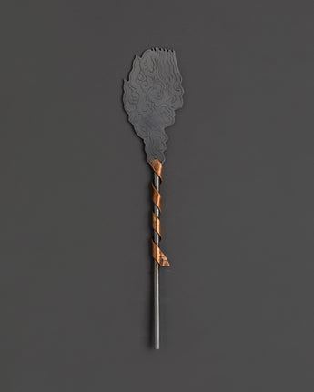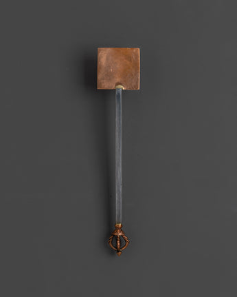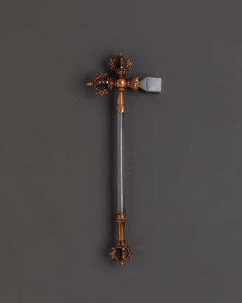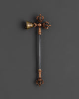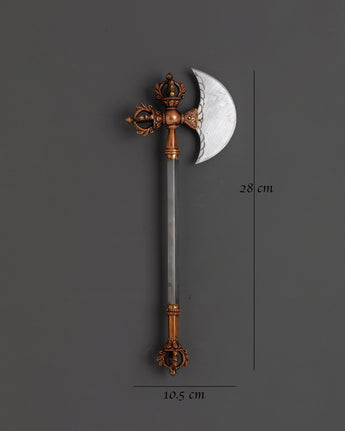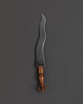This magnificent Tibetan Ritual Weapons Set consists of hand-forged copper and iron instruments that symbolize the potent spirit of ancient Buddhist traditions. This collection features a diverse range of ceremonial weapons, including swords adorned with half vajras, axes, hammers, chains, and shurikens, each representing spiritual protection, strength, and the annihilation of obstacles. Standing 28 cm tall and 10.5 cm wide, these Himalayan-crafted tools are ideal for adding a genuine, sacred touch to any altar, meditation area, or spiritual collection. The iron and copper craftsmanship not only showcases beautiful design but also reveals the profound meaning inherent in Tibetan ceremonial artifacts.