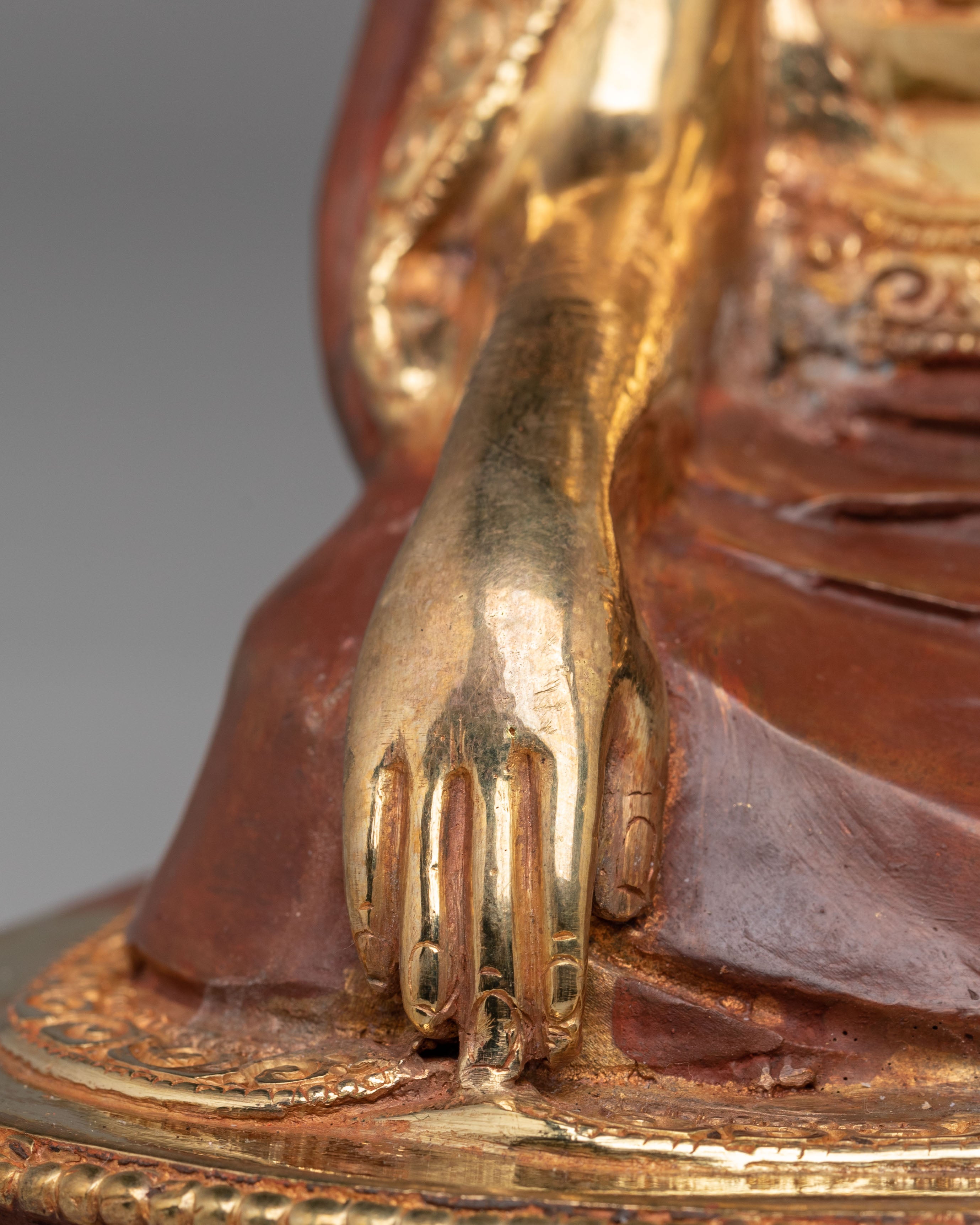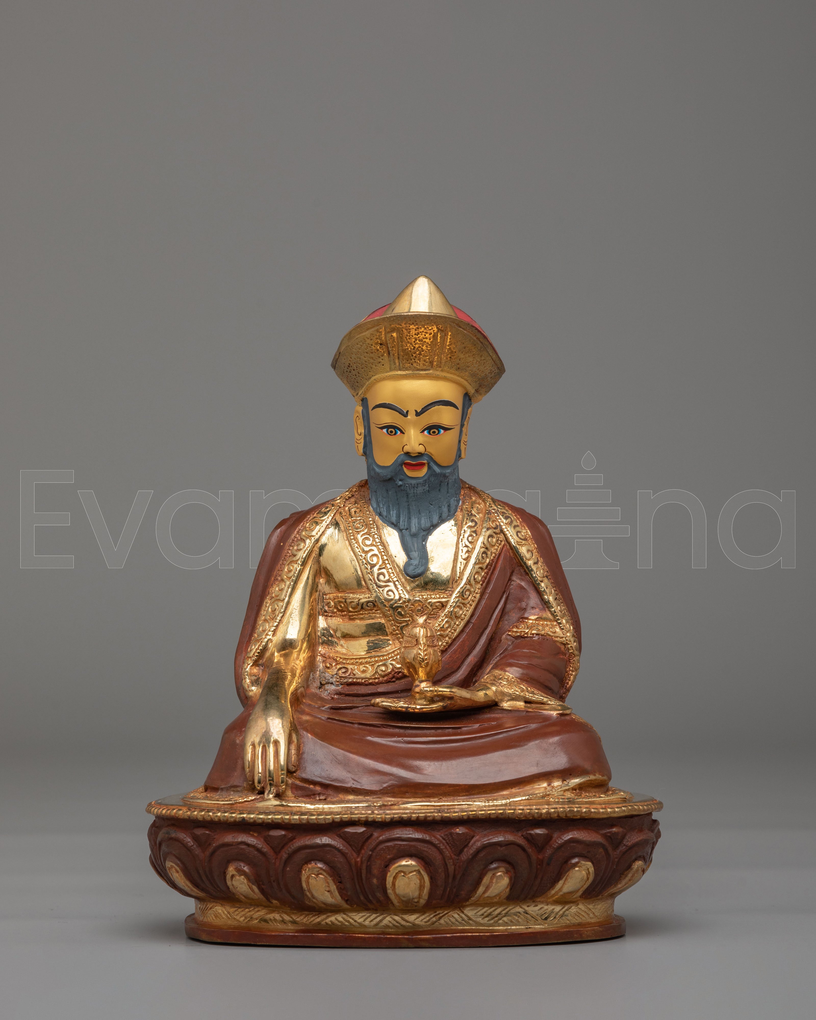 The Tibetan Sacred Guru Shapdum Statue embodies the profound symbolism of spiritual guidance, protection, and wisdom. Guru Shapdum is depicted in a serene and compassionate pose, with his hands in a gesture of offering protection and blessings to all beings. The 24K gold plating reflects purity and divine enlightenment, while the copper body signifies the connection between the material and spiritual realms. The intricate acrylic color detailing brings life to his robes and facial expression, enhancing his sacred presence. The statue’s overall design symbolizes the harmonious balance between wisdom and compassion, reminding practitioners of the Guru's protective energy and the path to spiritual awakening.