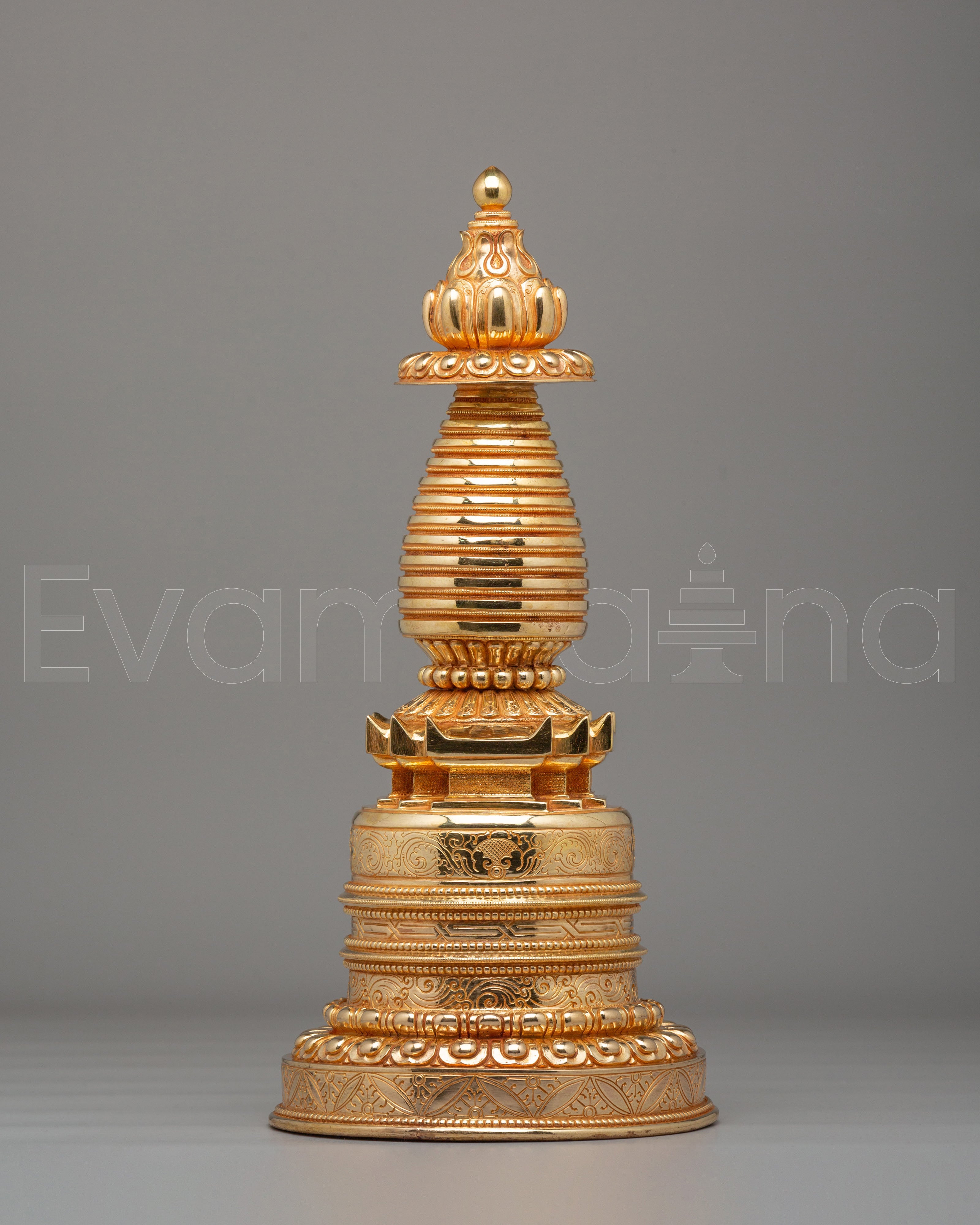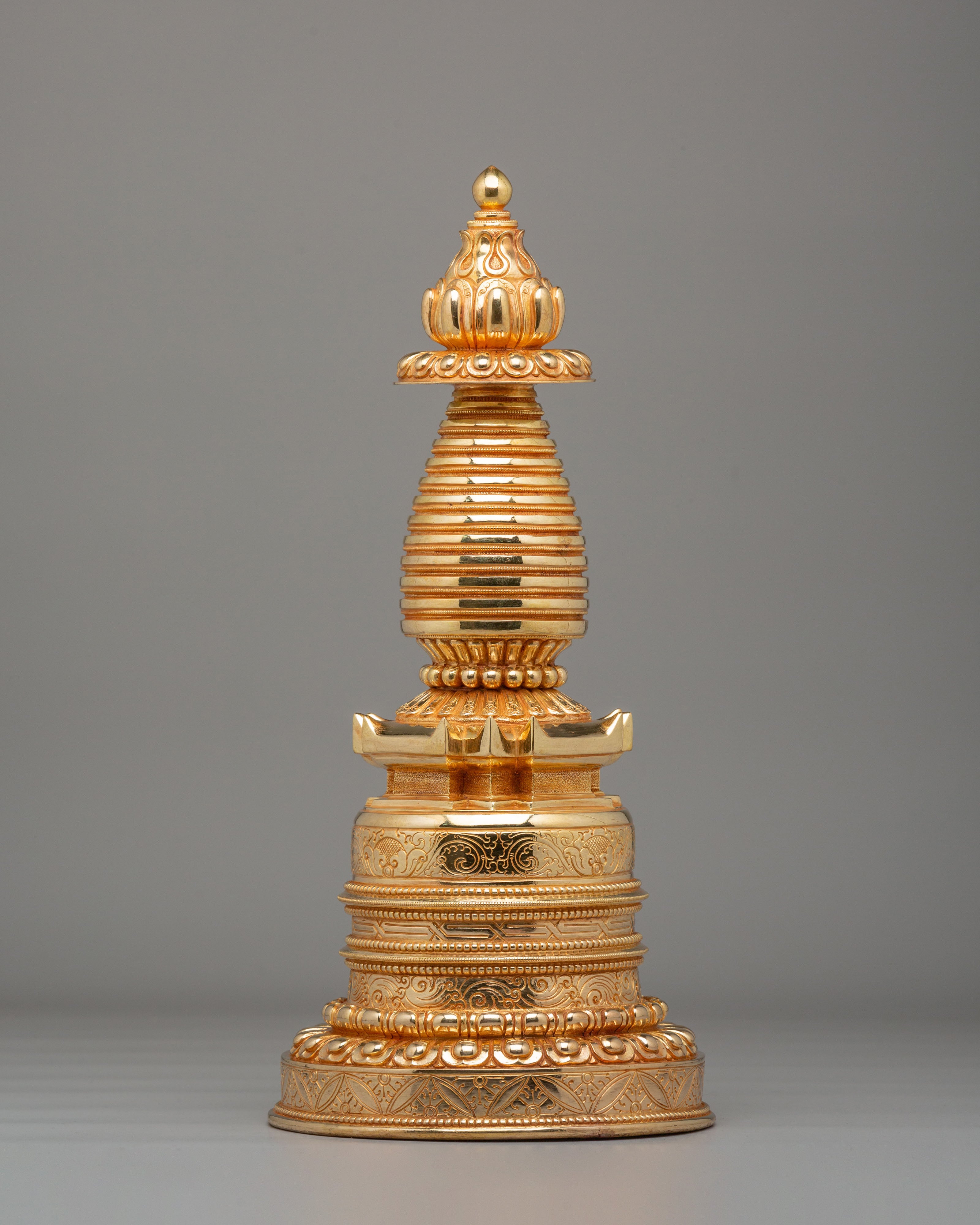 The Kadampa stupa features the iconic tiered structure with a central dome, representing the Buddha's teachings and the stupa's role in preserving and transmitting wisdom. The base of the stupa is adorned with delicate patterns and lotus petals, symbolizing purity and spiritual growth. The design also highlights sacred geometric elements that reflect the unity of the universe and the interconnectedness of all beings, making this stupa a powerful tool for meditation and spiritual focus. The 24K gold plating gives the stupa a vibrant, luminous quality, symbolizing the divine light of wisdom and enlightenment.