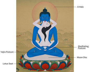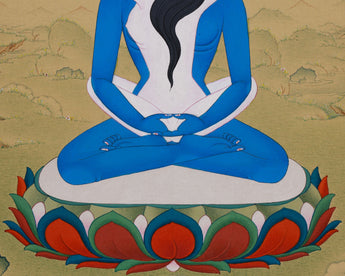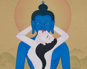 An incredible work of Tibetan art, this Samantabhadra Buddha Thangka was meticulously hand-painted using Lhasa stone colors on high-quality cotton canvas. Vivid Hues and intricate details bring Samantabhadra's serene and peaceful presence to life, making this thangka not only a piece of art but also a profound tool for meditation and reflection. The calming aura of Samantabhadra, depicted in deep blue tones, symbolizes the boundless wisdom that transcends all barriers and connects with the universe.