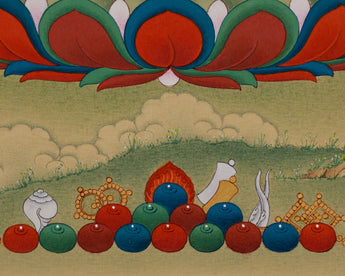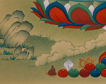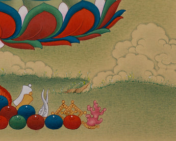 This is a rare and intricate piece of Tibetan art that embodies the spiritual essence of the Buddha. Our artist has carefully painted the thangka, ensuring every stroke and color choice reflects the intended symbolism.