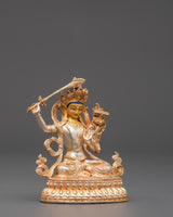 This Tibetan sculpture of Manjushri is a magnificent representation of knowledge in Buddhist tradition. It is made of copper with exquisite gold and silver plating and measures 9.5cm in height by 8.5cm in width. It weighs 0.20kg. Manjushri, the Bodhisattva of Wisdom, holds a fiery sword in one hand to cut through ignorance and a lotus stem in the other, making this statue a powerful tool for meditation, learning, and spiritual inspiration.