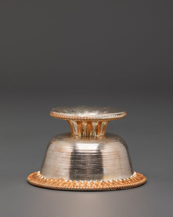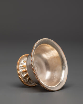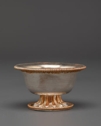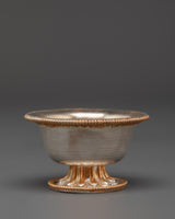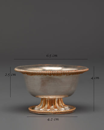 Enhance your sacred place with this magnificent Tibetan Seven Offering Bowl Set, made of copper with delicate silver and electro gold plating. Each bowl is 6.5cm in diameter, 4cm tall, with a base of 4.2cm, and can accommodate offerings up to 2.5cm deep. This complete set, weighing only 0.39 kg, is ideal for everyday ritual use, altar setups, or temple rituals.
