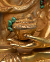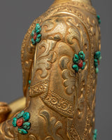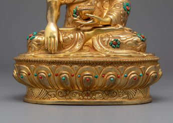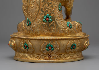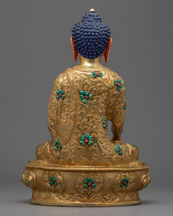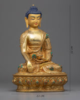 Delicately handcrafted in our workshop, the Tibetan Shakyamuni Buddha statue is intricately designed with unique Nepali motifs. The body of Shakyamuni Buddha, made out of copper, is coated in 24-Karat pure gold. Gilded gold, the statue exhibits excellent luster. The gold-plated halo behind Shakyamuni Buddha in the statue emphasizes his tranquil look as he rests on a moon disc lotus with an alms bowl on his right lap. Our craftsmen meticulously set gemstones for the Shakyamuni's robe and lotus seat. He is depicted portraying the 'Bhumisparsa Mudra' or the 'touching the Earth' hand gesture that presents the moment of Buddha's awakening.