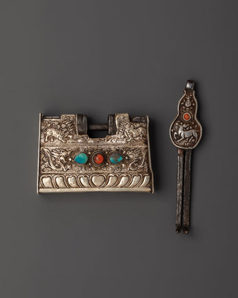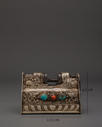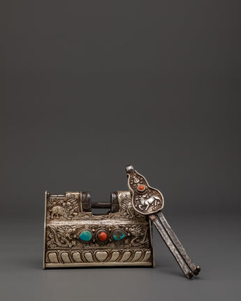 Tibetan Silver Ritual Padlock with Key | Handcrafted Buddhist Chest Lock