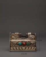 This Tibetan Silver Padlock with Key is a magnificent combination of functional and religious art, featuring complex dragon and floral themes. The lock has been decorated with coral and turquoise stones, which are highly valued in Tibetan culture for their protective and healing properties. This lock is 9.5cm in height and 12.5cm in width, is made of Pure silver, and weighs 0.67kg, making it a significant and collectible ritual object.