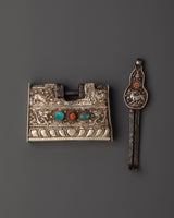 The decorative key is 16.5 cm tall and 3.5 cm wide, with corresponding designs that fit firmly into the locking mechanism. With a total weight of 0.77 kg, the set feels strong and ceremonial, making it suitable for securing monastery chests, sacred boxes, or serving as a decorative centerpiece in a spiritual setting. The artistry displays a strong relationship to Tibetan metalworking traditions and Buddhist iconography.