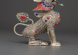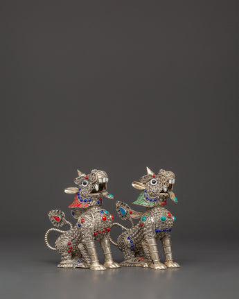 Tibetan Snow Lion Buddhist Protector Set | Silver-Plated White Metal Guardian Statues