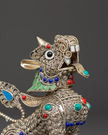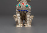 This Tibetan Snow Lion Set is a stunningly designed pair of guardian sculptures made of white metal with a silver-plated finish and embellished with inlaid coral and turquoise stones. Each lion is 14 cm tall and 13 cm wide, weighing 0.186 kg each and 0.372 kg. With their dynamic posture, whirling tails, and gem-studded bodies, these lions represent power, majesty, and spiritual elegance, making them ideal for altar setup, ritual use, or cultural adornment.