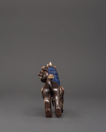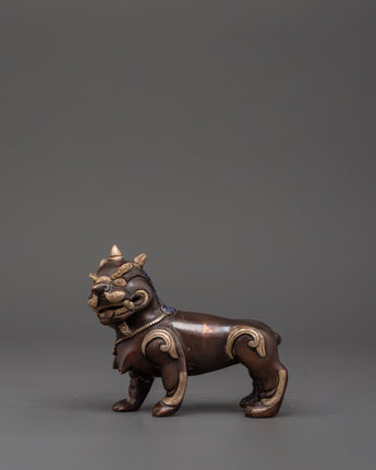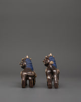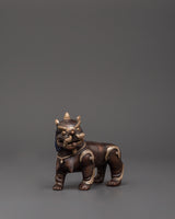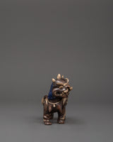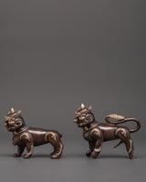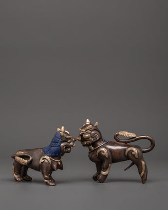 This handmade Snow Lion Statue Set embodies the ferocious compassion and protection of Tibetan tradition and will make a powerful addition to your spiritual environment. These 11.5cm tall guardian statues are meticulously carved from oxidized copper and plated with silver, emphasizing their magnificent features. Snow lions are traditionally seen as defenders of dharma, representing bravery, strength, and boundless pleasure.