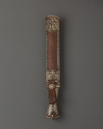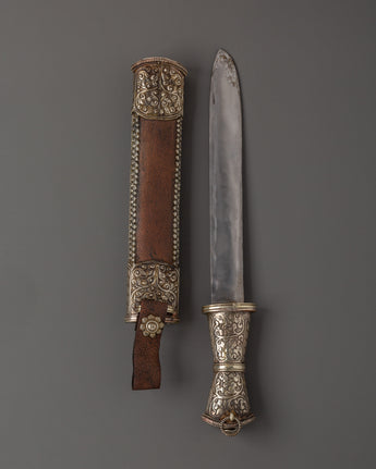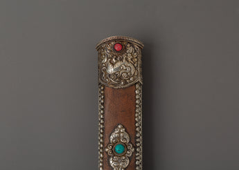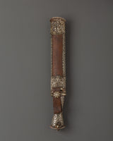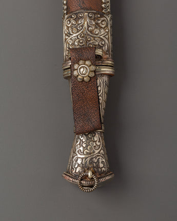 A Tibetan knife, also called a "phurba" or "kila," has cultural and symbolic meaning in Tibetan traditions. The unique three-sided blade of this ceremonial dagger represents the victory over ignorance, desire, and aversion in Buddhism. Tibetan knives, which are adorned with elaborate carvings and frequently have a tripartite handle representing different gods, are an essential part of religious rites, ceremonies, and spiritual practices. In addition to their spiritual significance, these knives might have practical uses in daily life, exhibiting a combination of deep cultural symbolism and usefulness in Tibetan communities.