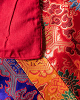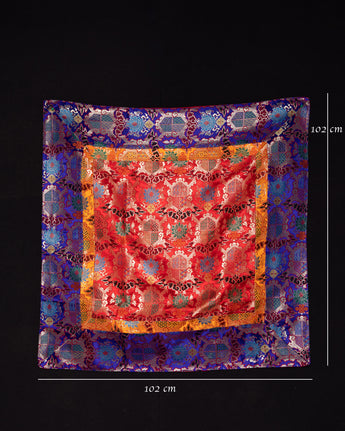 The cloth contains bright Buddhist images that represent prosperity, protection, and spiritual peace. The deep red core is surrounded by golden, blue, and purple borders, with each color representing a distinct component of enlightenment and harmony in Tibetan Buddhism. The fabric, made of fine silk, has a smooth and glossy texture that ensures longevity as well as aesthetic appeal. Its sacred motifs make it especially fitting as an altar cloth or ceremonial cover.