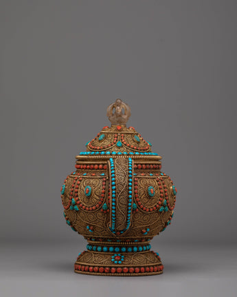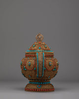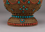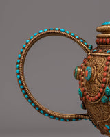 This Tibetan Tea Pot for Home Decor is a beautifully crafted, functional piece that brings both elegance and spiritual energy to any space. Standing at 26cm tall and measuring 28cm in width, it features a copper body adorned with intricate filigree work and coral and turquoise artificial stones, adding vibrant color and symbolism. Weighing 1.65kg, it has a solid, substantial presence, making it ideal for both tea ceremonies and as an ornamental decoration.