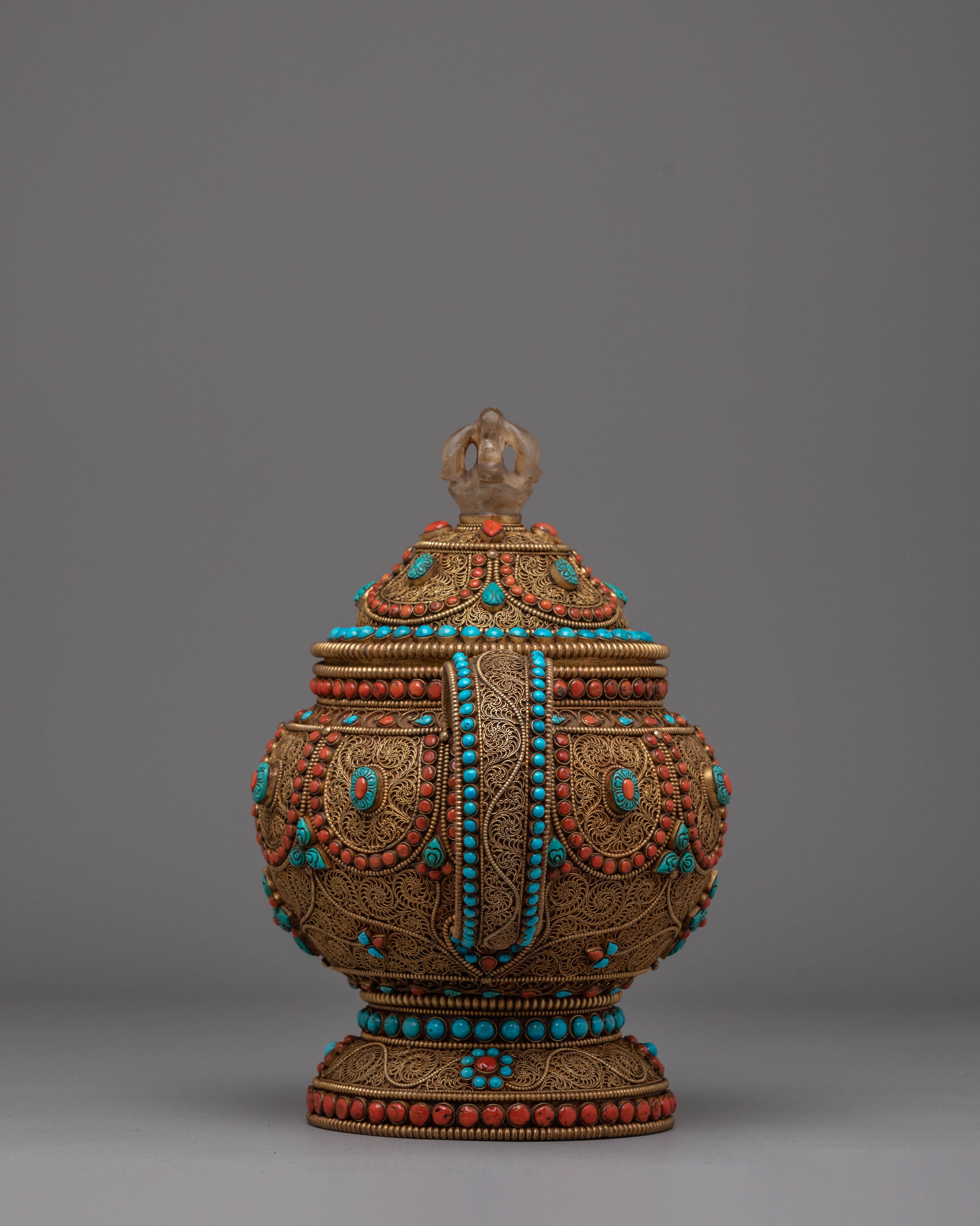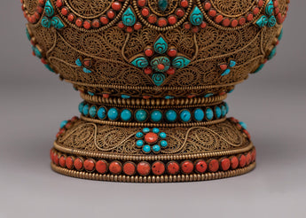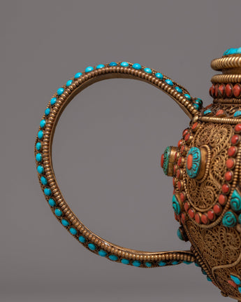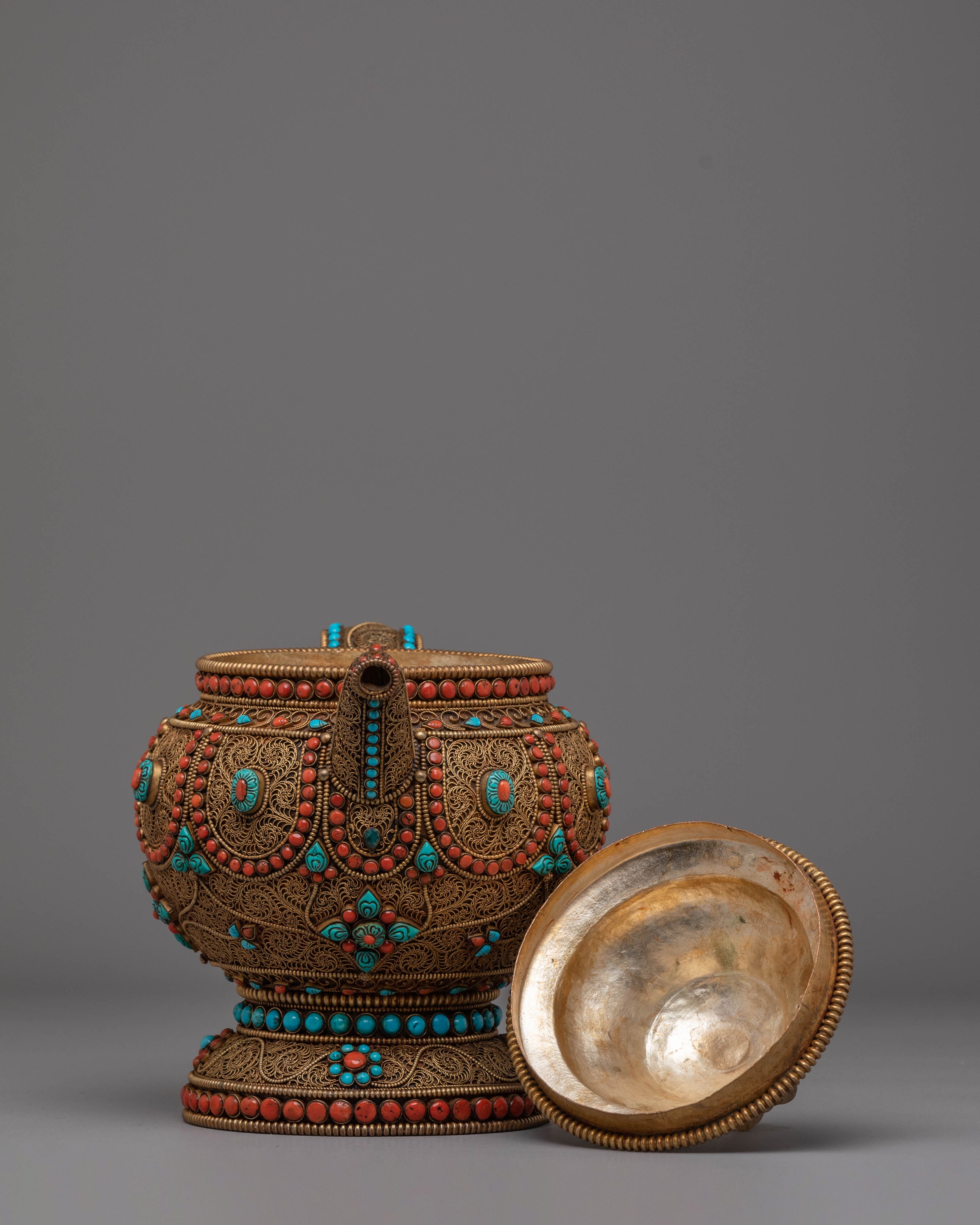The teapot’s design reflects traditional Tibetan motifs and craftsmanship. The filigree work showcases delicate patterns that represent harmony and spiritual beauty, while the coral and turquoise stones symbolize vitality, protection, and spiritual healing. The intricate detailing adds texture and depth, making this teapot not just a functional item but a piece of art that enhances any living space. The teapot is designed with a spacious opening and a well-crafted spout for practical use, allowing you to serve tea while enjoying its aesthetic value.