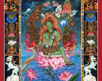 This Tibetan Thangka Green Tara print is of the most well-known deity in the Buddhist community Tara, a female Buddha. Within the Tibetan Himalayan population, Tara is a widely practiced deity. Tara is referred to as the mother of emancipation and the goddess of compassion. Mother, you are always there for us. We make a special effort to dedicate ourselves to her protection and blessings in our daily life.