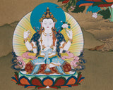 It is executed in the Karma Gadri style, a distinctive visual language within Tibetan art that emphasizes spaciousness, elegance, and emotional clarity. The Karma Gadri compositions offer open, breathable landscapes, allowing central deities to emerge with calm authority. The thangka's soft gradations, harmonious color palette, and balanced layout are trademarks of this refined artistic lineage, making it both contemplative and visually striking.