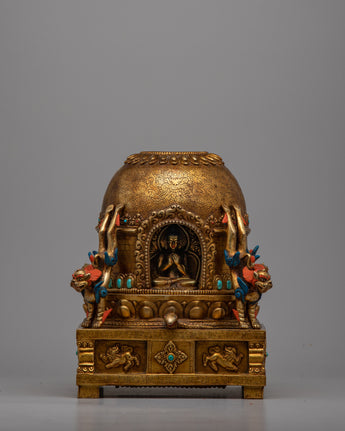 This finely detailed stupa is a masterful representation of Buddhist religious art, embodying spiritual symbolism and exquisite craftsmanship. Constructed on a Copper body and gold-plated, this stupa is a visual marvel and a sacred object of reverence.
