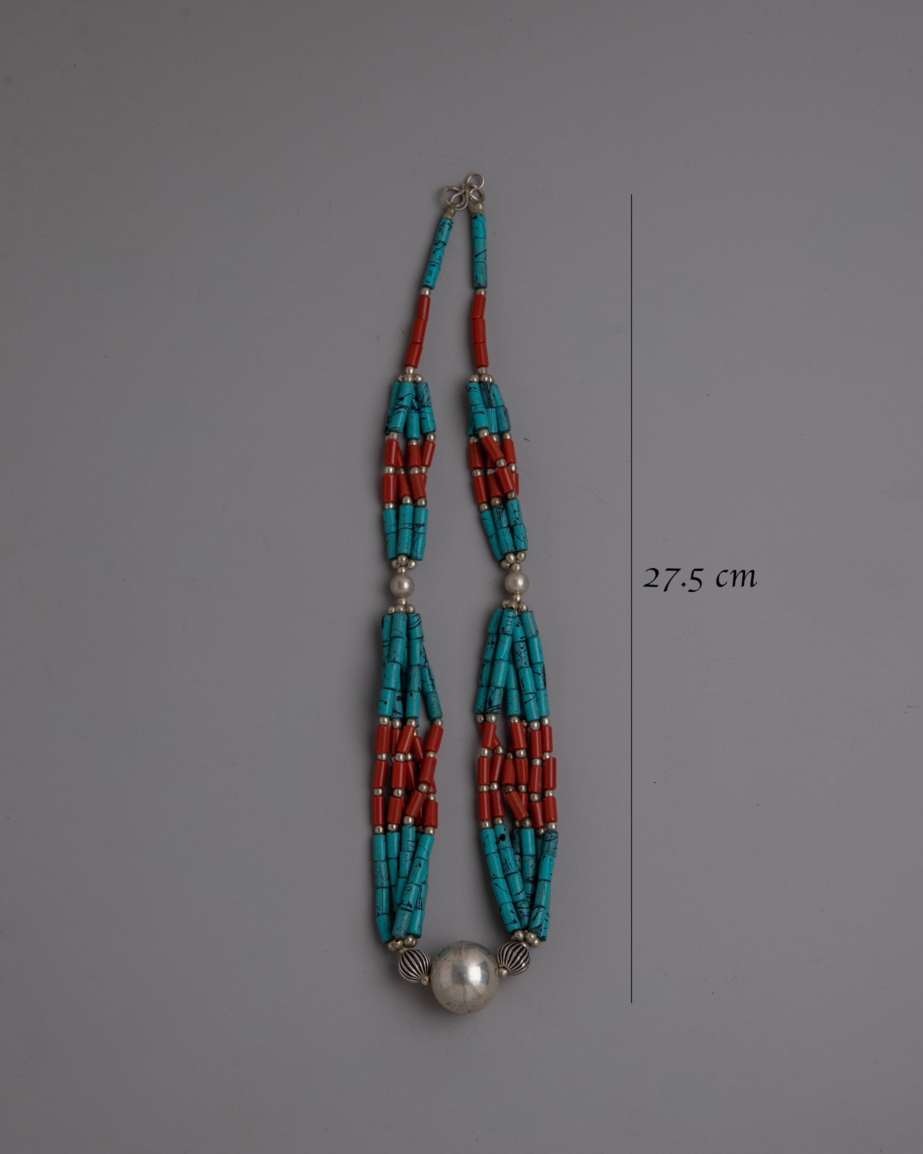 The Tibetan Turquoise Jewelry Necklace is a pretty piece of jewelry representing spirituality and cultural identity, making it the perfect accessory for people who value distinctive and culturally meaningful items. Whether it is worn as a highlighting everyday object, during special occasions, or meditation, this necklace gives depth and refinement to any ensemble. It is a treasured addition to any jewelry collection because of the way it draws attention and sparks discussion.