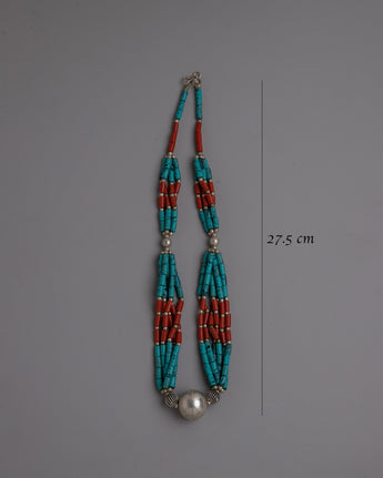 The Tibetan Turquoise Jewelry Necklace is a stunningly manufactured piece that embodies both bright style and traditional craftsmanship. This gorgeous necklace is made of white metal, weighs 0.068 kilograms, and is decorated with artificial turquoise, coral, and lapis lazuli stones. It is 27.5 cm long. The exquisite craftsmanship and vibrant gemstones reflect Tibetan jewelry's rich cultural legacy and creative traditions.